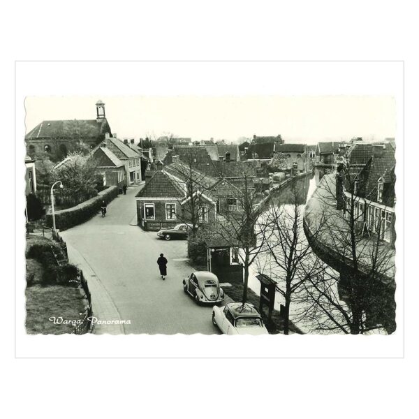 Panorama van Warga, of Wergea. Dat ligt in het hart van Friesland. Door het dorp stroomt de Wargaastervaart langs de straat Grote Buren. Deze vaart was ooit een belangrijke vrachtroute tussen Leeuwarden, Grouw en Sneek. Langs dit water voer de kleine handelsvaart: turf ging noordwaarts, aardappelen en graan zuidwaarts. Het was een stille maar onmisbare ader in het Friese landschap. Vandaag is die bedrijvigheid verdwenen en glijdt vooral de pleziervaart nog over het water, als een rustige herinnering aan wat ooit was. In het straatbeeld staan maar liefst twee Citroën DS van het eerste type. De ansichtkaart is omstreeks 1958 of 1959 gemaakt. Superieure reproductie met zeer fraaie grijstinten, verkrijgbaar als A1 en en A2.